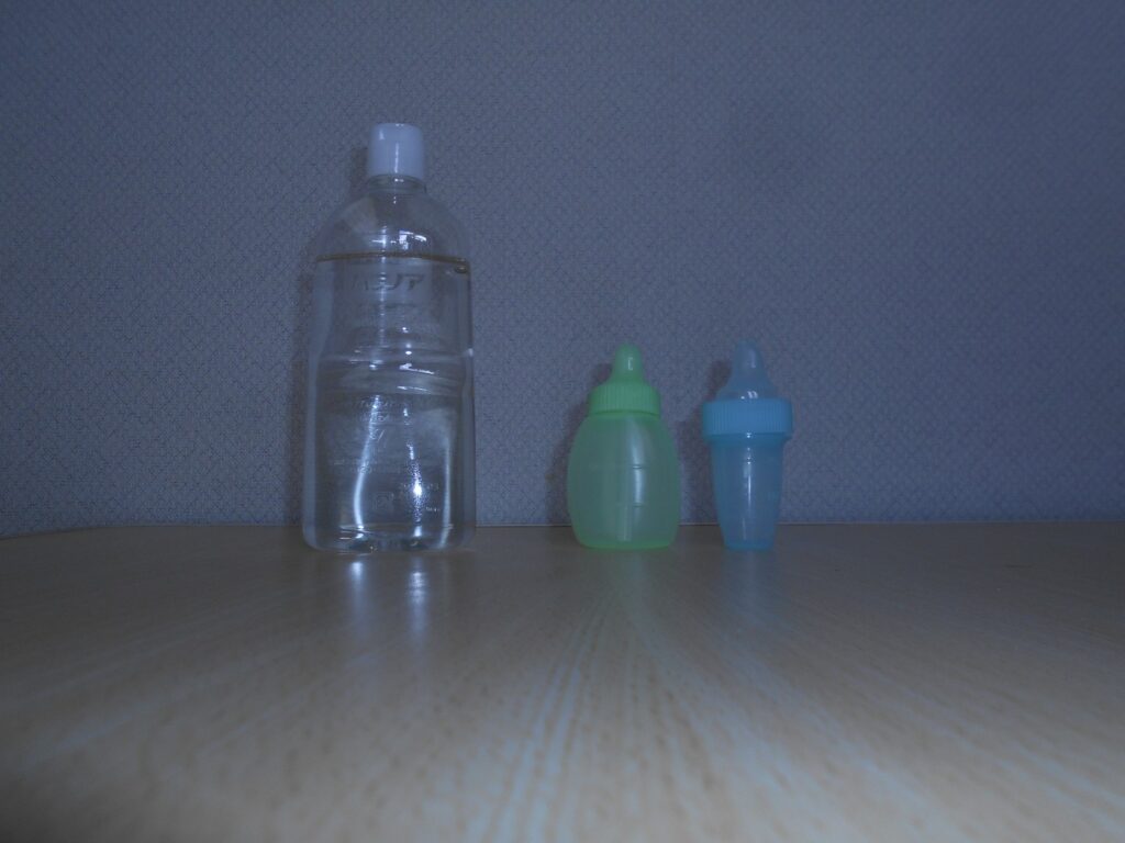 ①ボトルに生理食塩水をたくさん入れる。